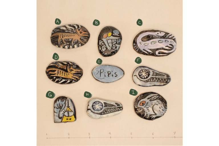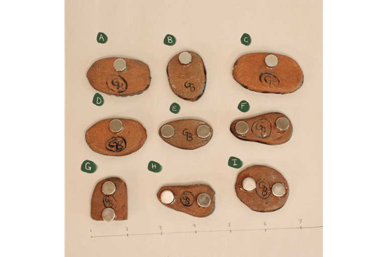 Cone 6 glazed stoneware, magnets adhered with E6000. They're quite sturdy and can survive being dropped most of the time!