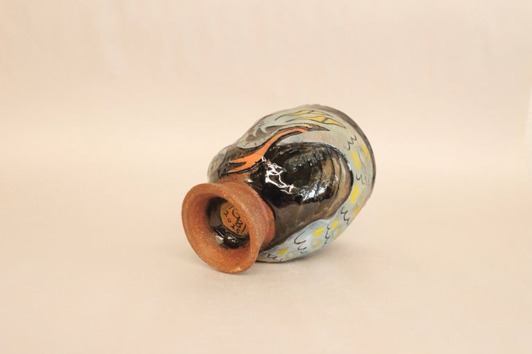 Cone 6 stoneware, ~4" tall. Holds about 6oz of liquid. Microwave and dishwasher safe.