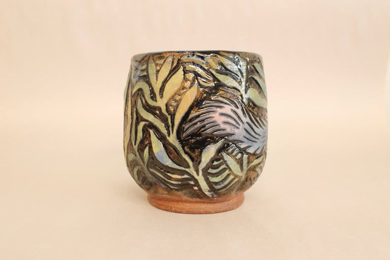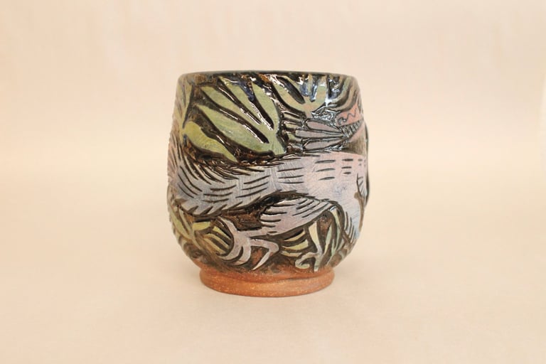 Cone 6 stoneware, thrown, 5" tall. Microwave and dishwasher safe.